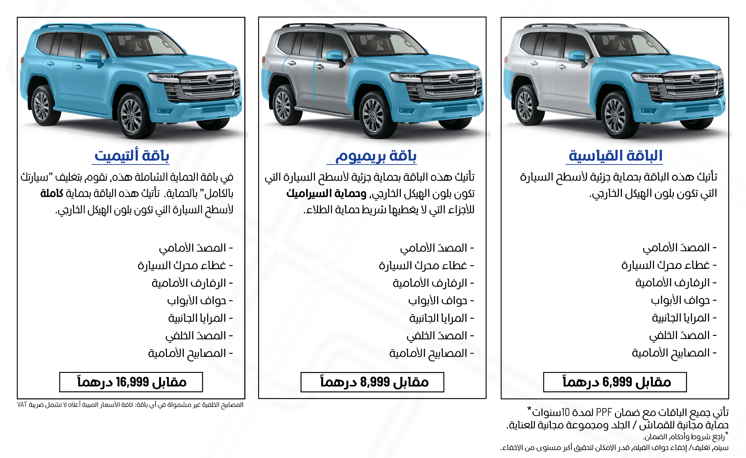 تأتيك "تويوتا خدمة ورعاية" بتشكيلة واسعة من الباقات التي تمنحك مستويات مختلفة من الحماية. أياً كانت الباقة التي تختارها، سيقوم خبراؤنا الفنين بتركيبها بسرعة وسهولة لتستمتع بقيادة سيارتك خلال وقت لا يُذكر.